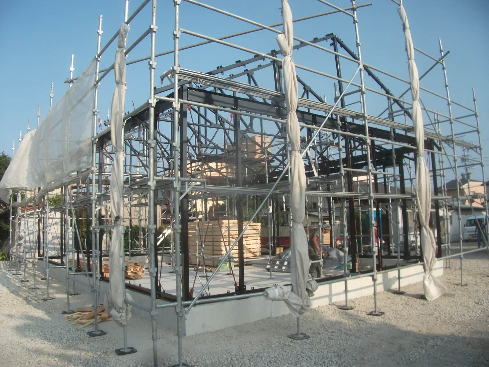 さて、累徳寺様の本堂の建設は、鉄骨の骨組みの建上げです。