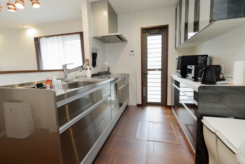 例えば、ヘアライン仕上げ、オールステンレスのキッチンは奥様のこだわり。クールでシックな雰囲気は、つや消しブラックのキッチン家電とのコーディネートが素敵です。