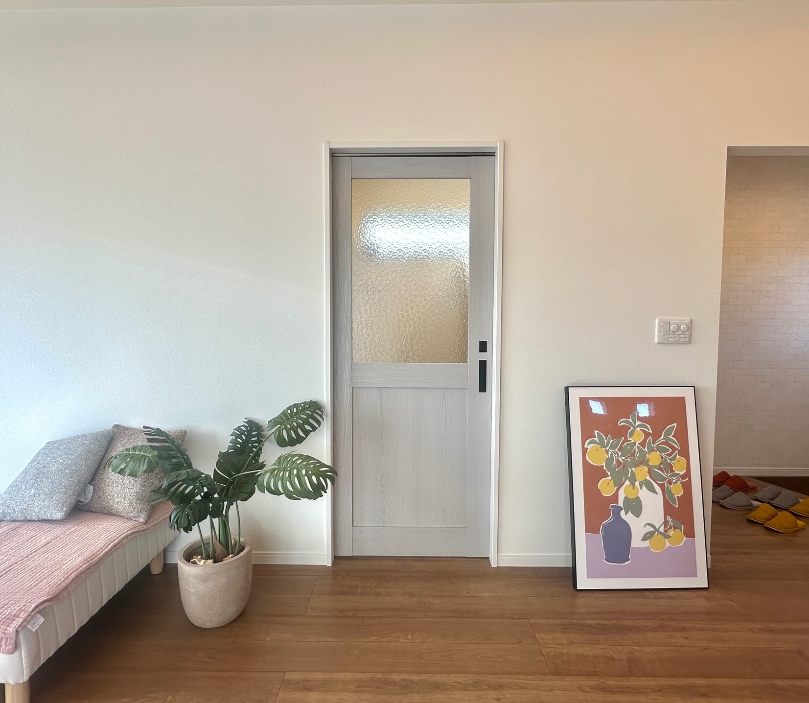 建具はグレージュ色がおしゃれなアンティークガラス調のドアをセレクトしました。