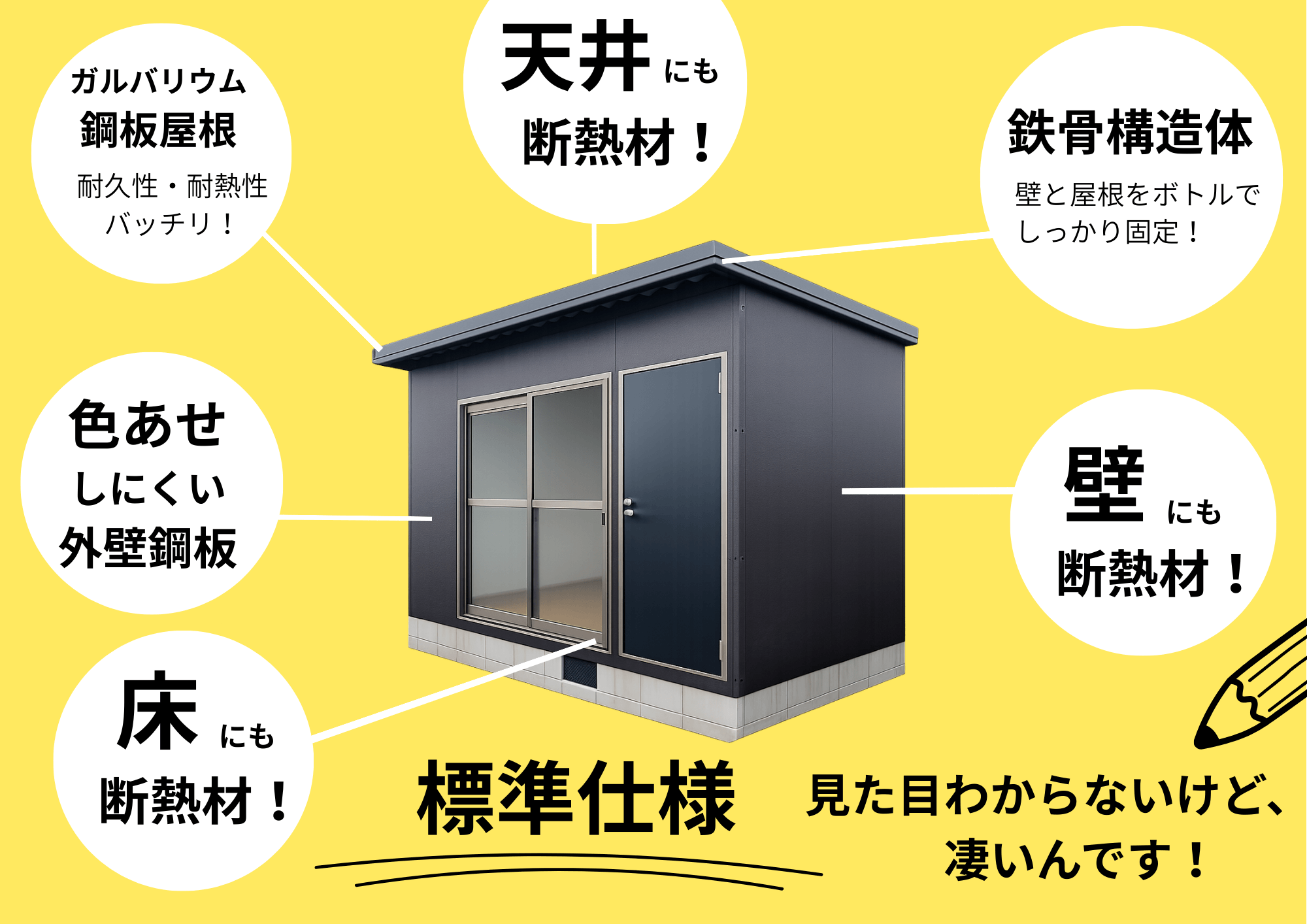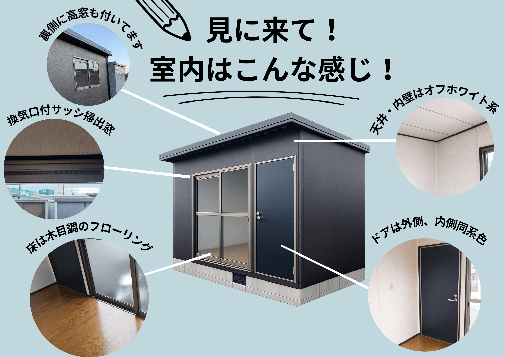 こちらは標準室内。お客様の用途やお好みで、窓・ドアの位置変更や追加も可能。「あったらいいな」にお応えできる多数のオプションも取り揃えております。