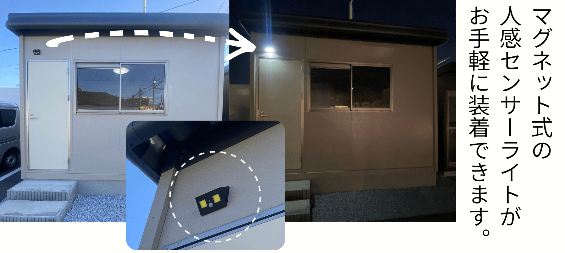 また、人の動きを感知して点灯するため、防犯ライトとしても効果的です。