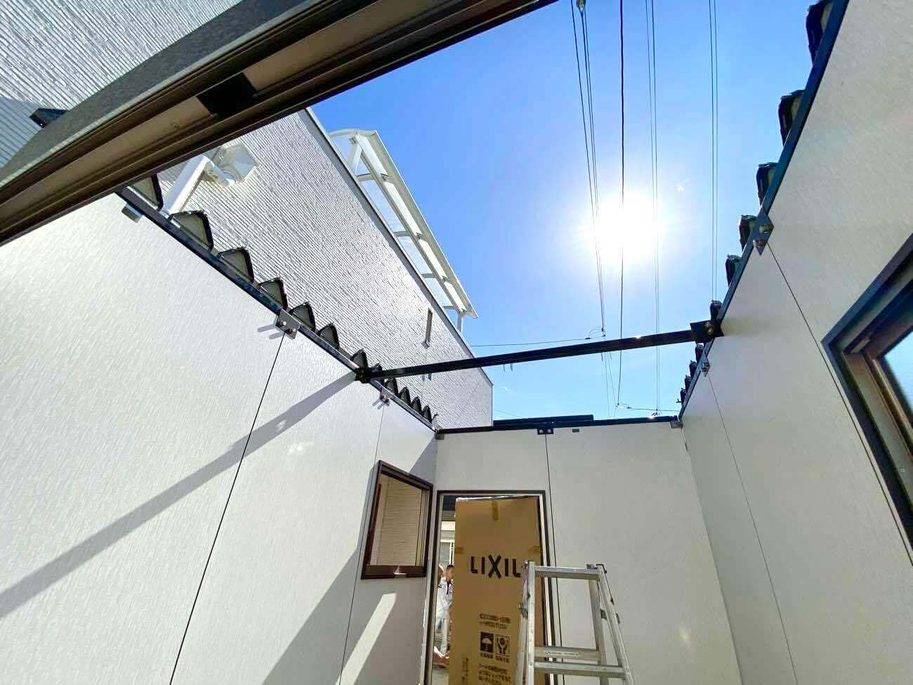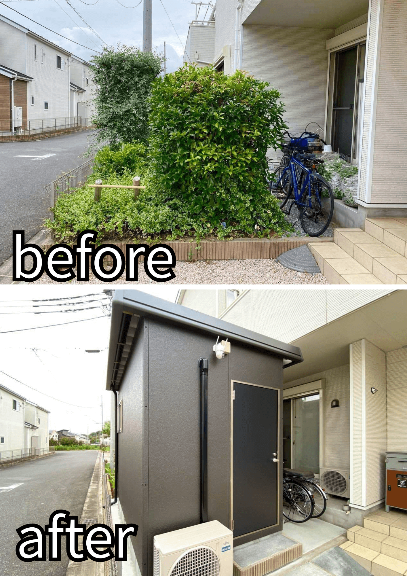 お庭の植栽を撤去後、土間コンクリートを打ち、その上にジュネス・スモールを設置させていただきました。