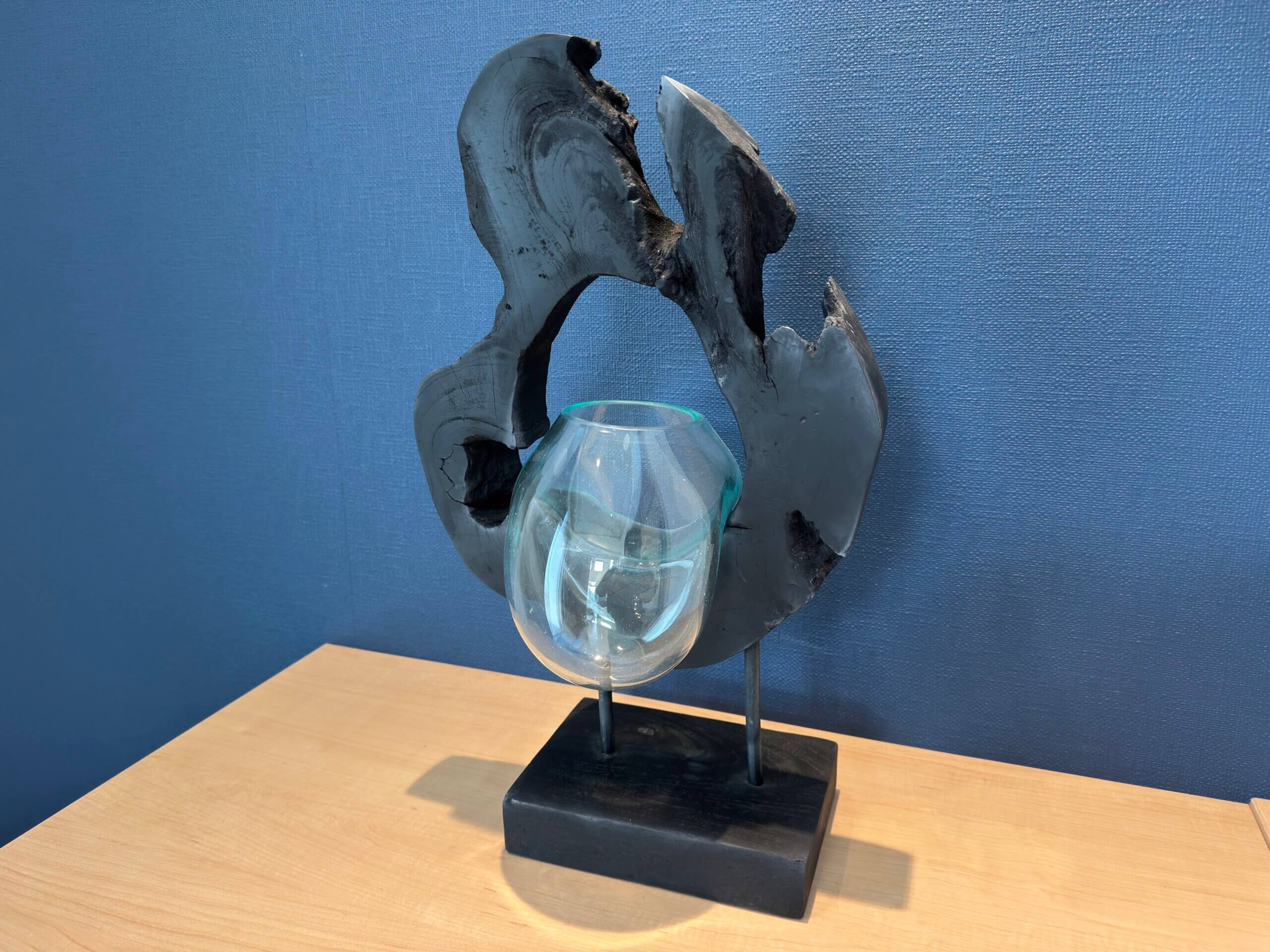 既にこのモデルハウスを見ていただいた方はお気づきかもしれませんが、オブジェも個性的なものが揃っています。これは玄関にあるガラスのオブジェで、天然木が使用されています。ガラス部と木部の形状は製品ごとに異なるため、非常にオリジナリティーがあります。おいてあるだけでセンスが良く見える逸品。