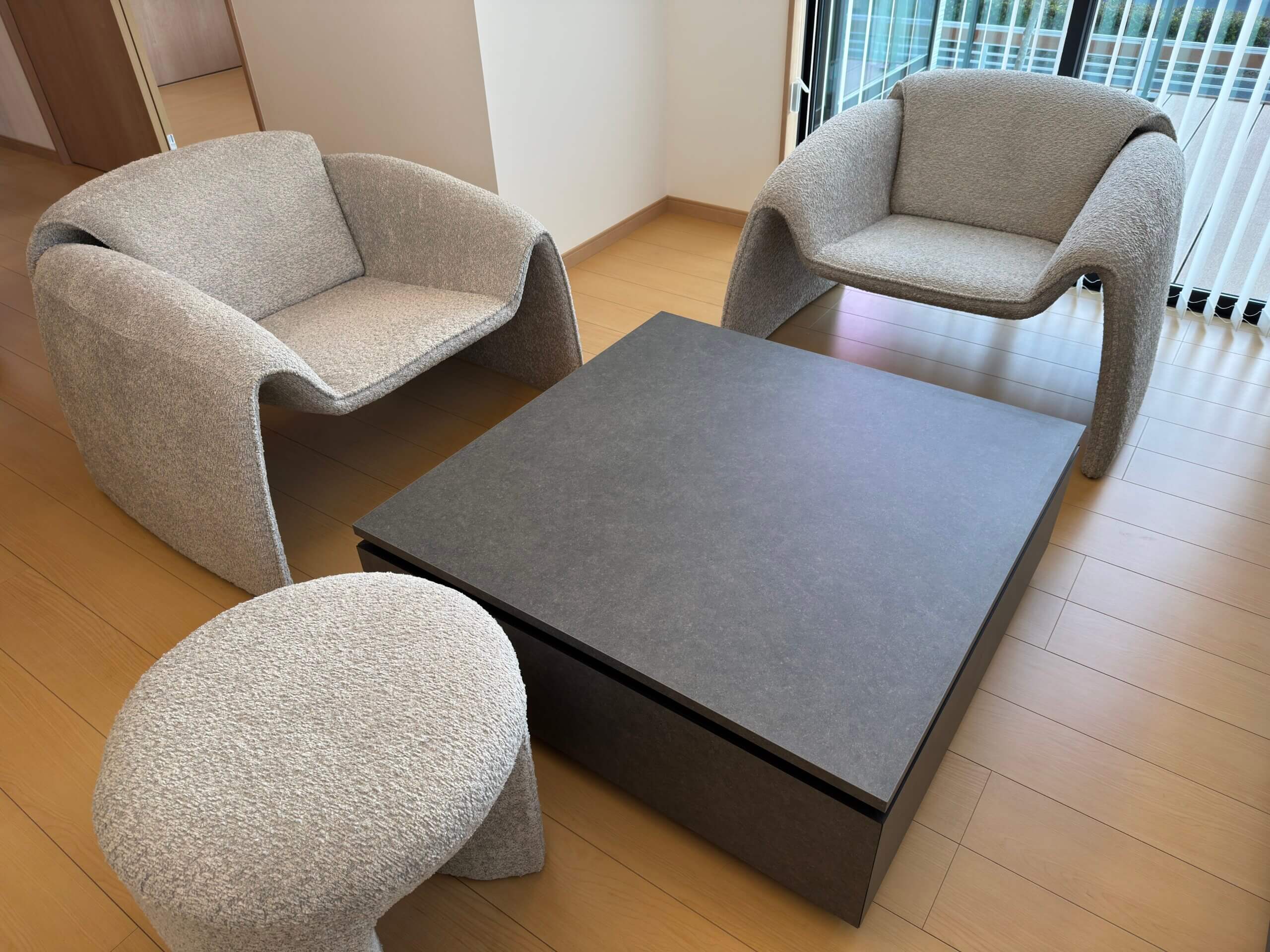 リビングには一人かけのソファとテーブル、スツールがあります。ソファは座面が大きめで座り心地も良いです。こちらはディスプレーとしてだけでなく、お客様との商談やお打合せスペースとしても活用しています。そのため快適かつリラックスしていただけるものを選びました。ご来場の際はぜひ座ってみてください。
