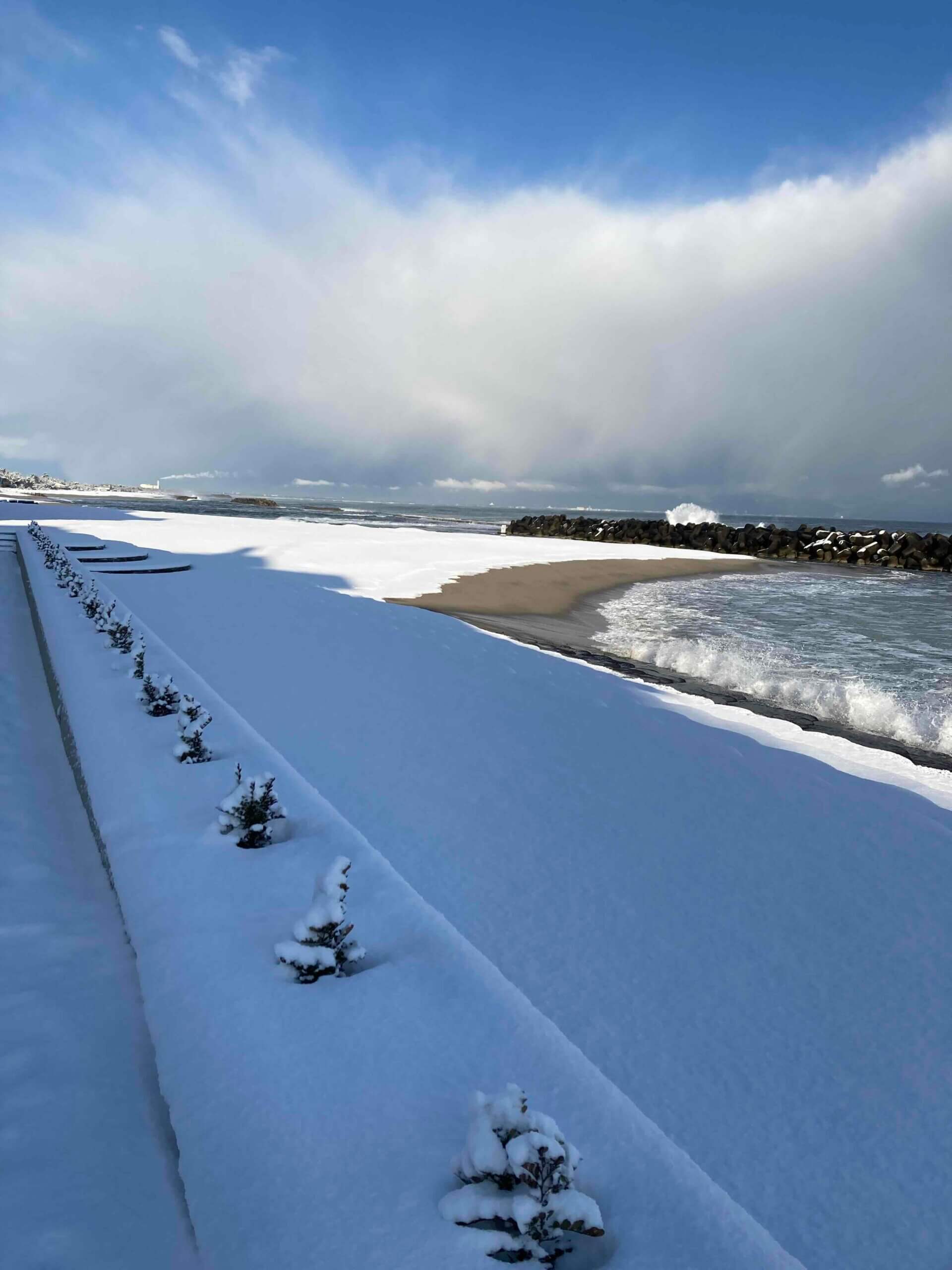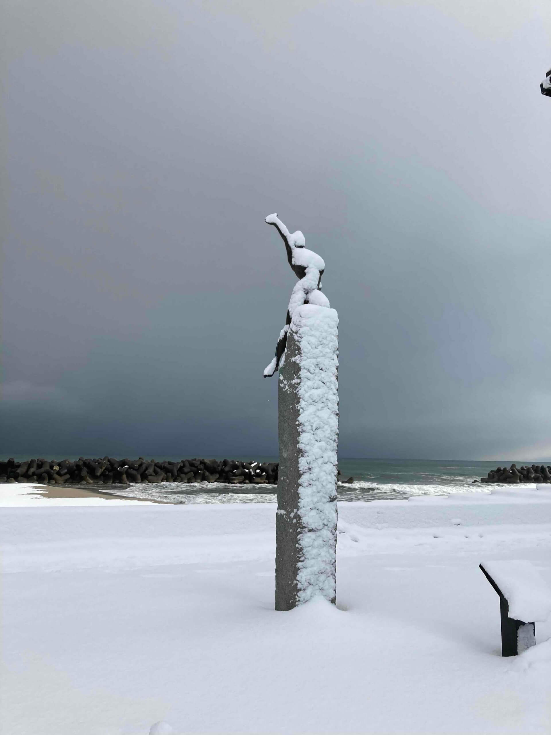 皆生温泉は日本で最初にトライアスロンの大会が行われた発祥の地でもあり、記念の像も設置されていますが・・・雪で見えません。