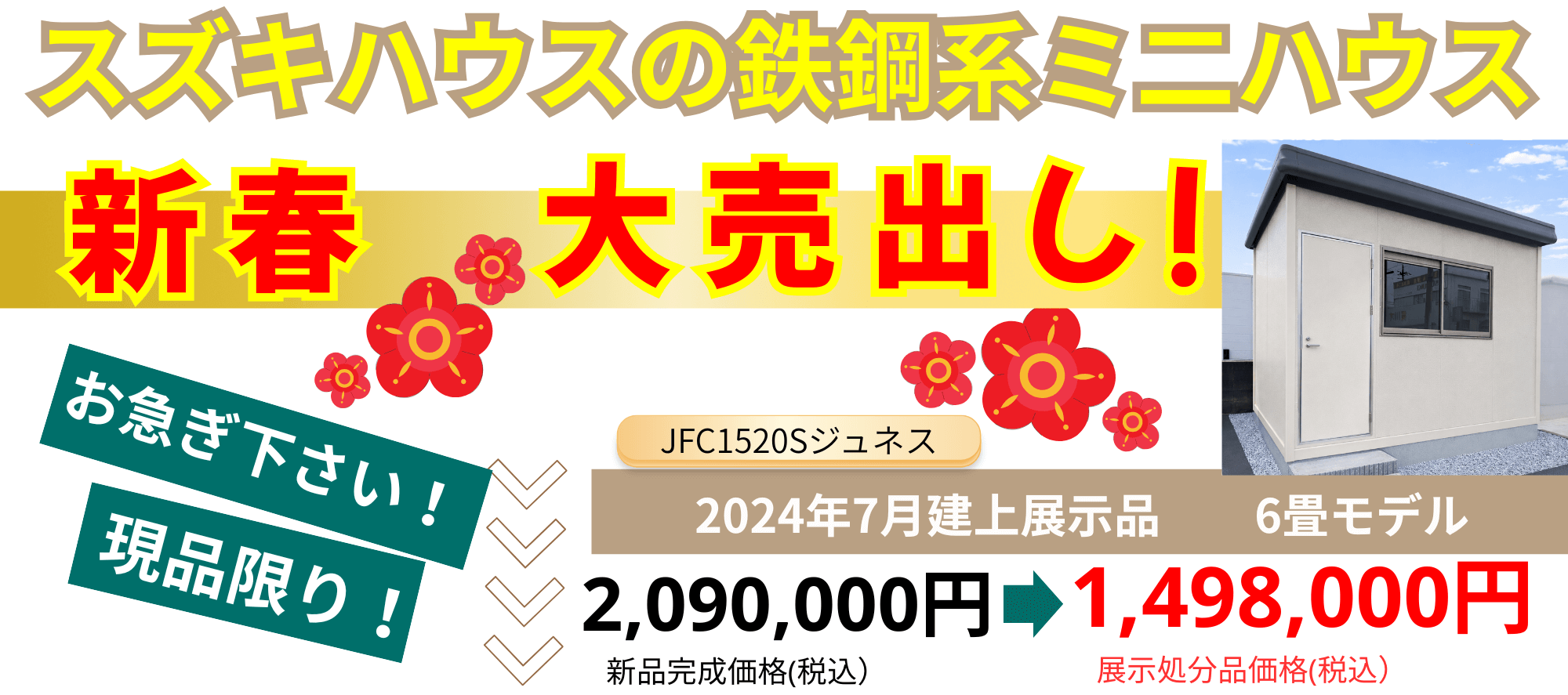 今回 「新春 大売出し!」といたしまして、名古屋展示モデル棟 鉄鋼系ミニハウス(JFC1520S) 1棟限定を超お値打価格でご提供いたします!随時、実際のご見学も可能です。
