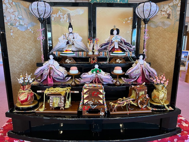 優しい表情のお内裏様とお雛様が並ぶ雛飾りは、ロビーに入った瞬間ふわりとした温もりを添えてくれます。