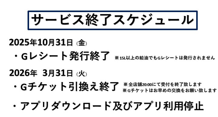 石油アプリのサービスである【Gチケット】のご使用に関しましては3月31日20:00までとさせて頂きます。