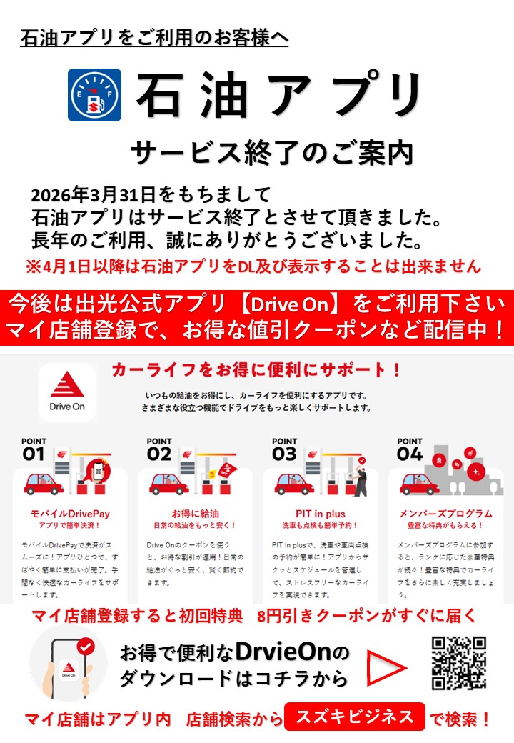 4月1日以降は、出光公式アプリ【Drive On】にてお得なクーポンや情報を発信してまいります。