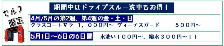 期間中はコーティング&ドライブスルー洗車sを特価にて販売しております。