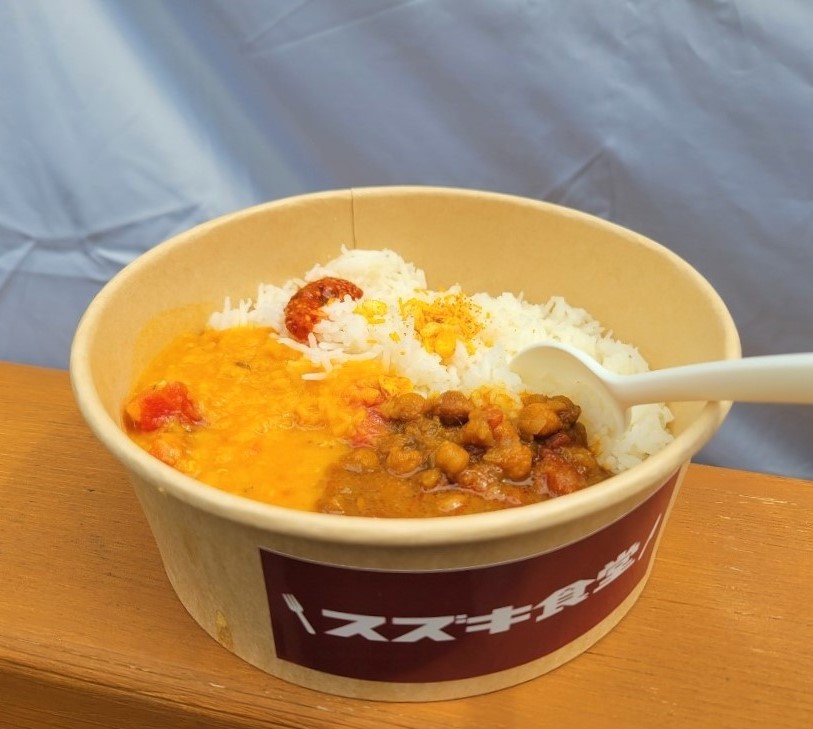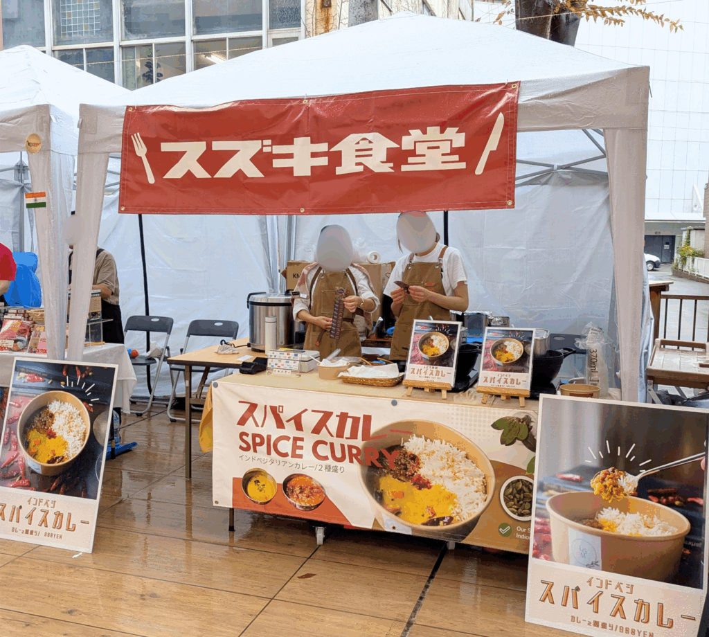 私たちはスズキ食堂インドカレーを販売しました!隣のブースではスズキカレーの監修をしている鳥善がトマトレンズダールと茶ひよこ豆マサラの2種類のルーを掛けたカレーを販売していました。